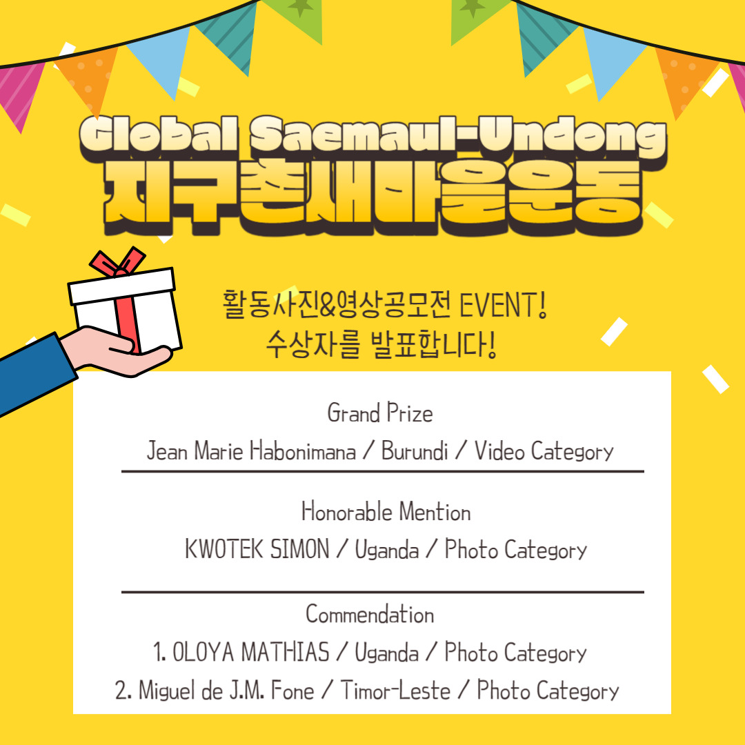 The Saemaul Undong Center hosted a global photo and video contest for the Global Saemaul Undong from December 30, 2022, to May 31, 2023. A total of 10 photo entries and 6 video submissions were received from countries participating in the movement.